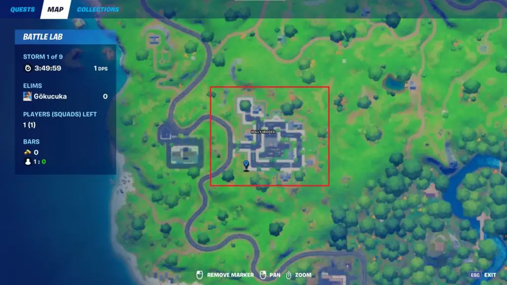 Screenshot via Epic Games The second clue is slightly more difficult because the post office box is hidden in a cabin. It will also be next to roads, making it a bit more difficult to find. The cabin in question is at the bottom left of Holly Hedges.